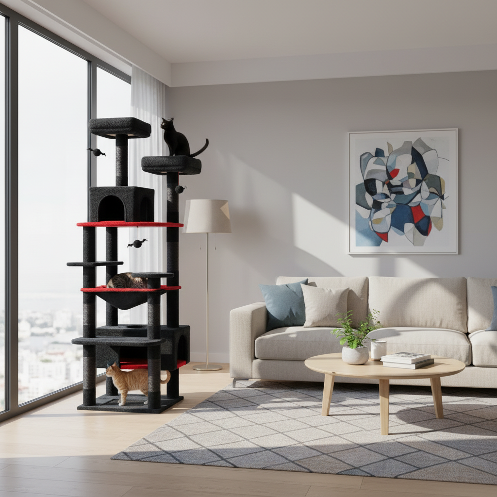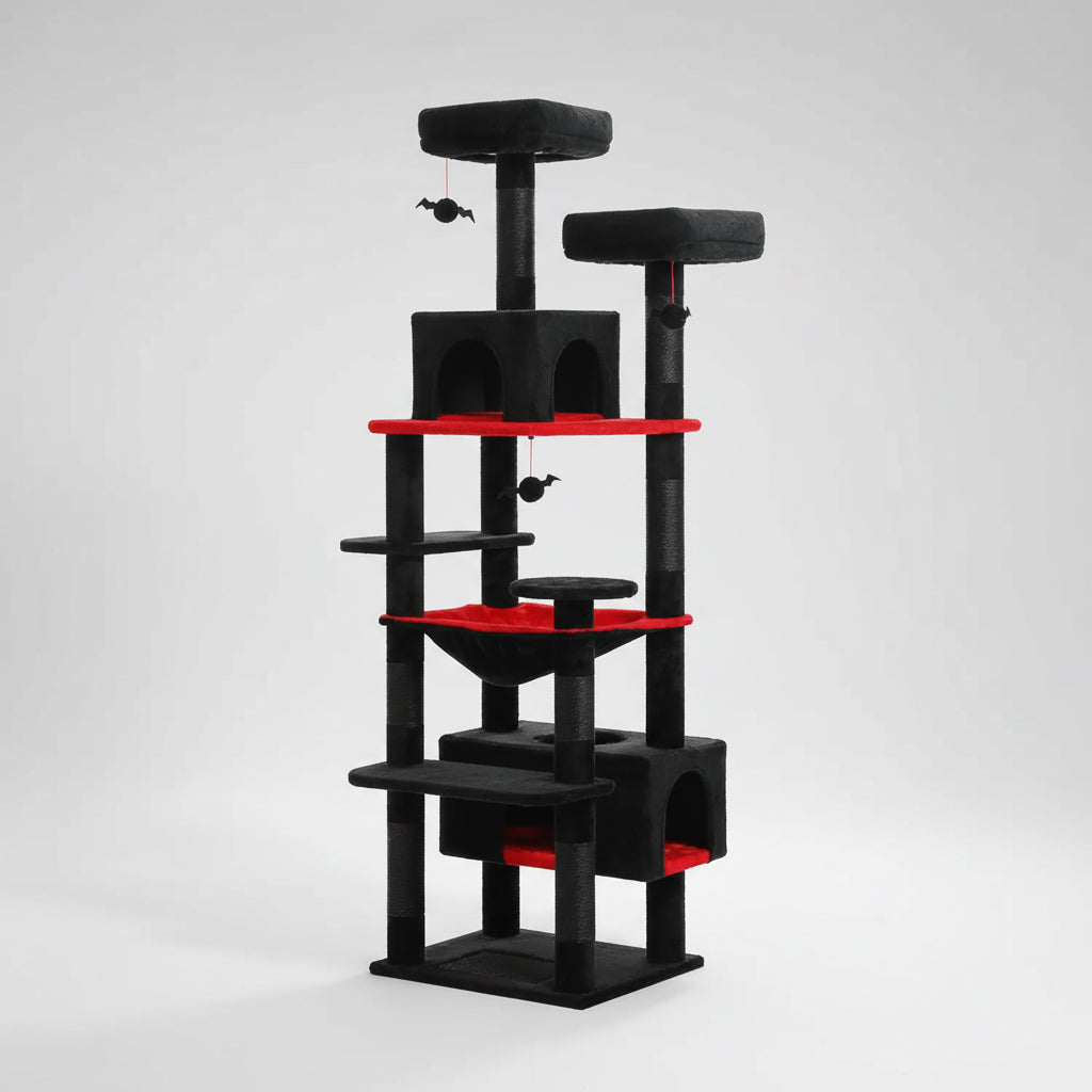 With a full height of 72in / 184cm and 8 exciting levels, this extra-large cat tree can accommodate multiple cats depending on their size and weight. The oversized rectangular condo and wide hammock are much larger than standard ones, giving your cats plenty of space to rest together or play hide-and-seek in their spooky fortress.