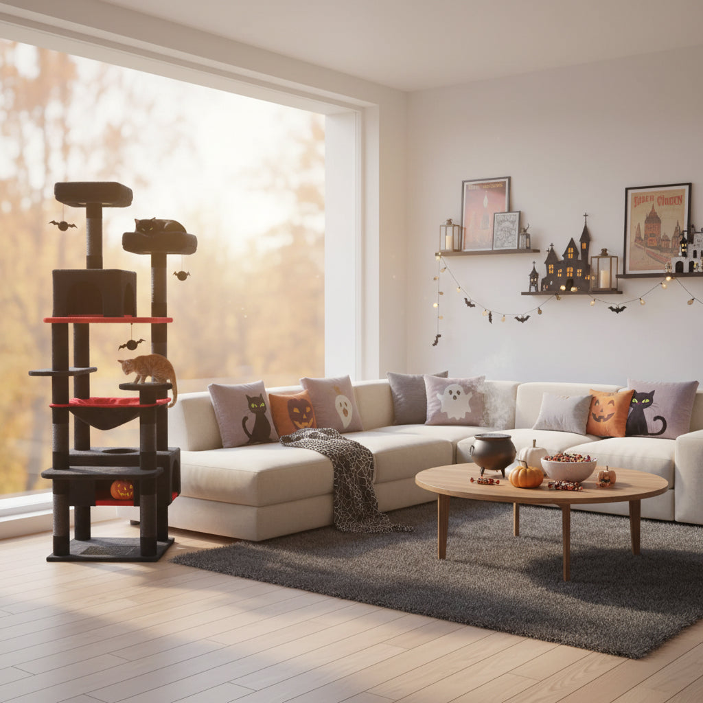 Decorated with a spiderweb pad and dangling bat toys, this cat tree brings Halloween flair to every playtime. The jumbo horizontal scratching pad (10.2 × 6.7 inches) and 7 sisal-wrapped posts satisfy all scratching instincts, keeping claws busy and your furniture safe — all while matching the spooky theme.