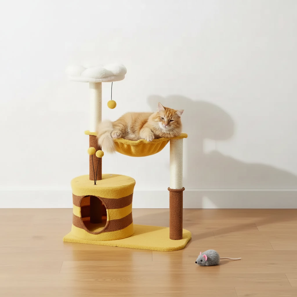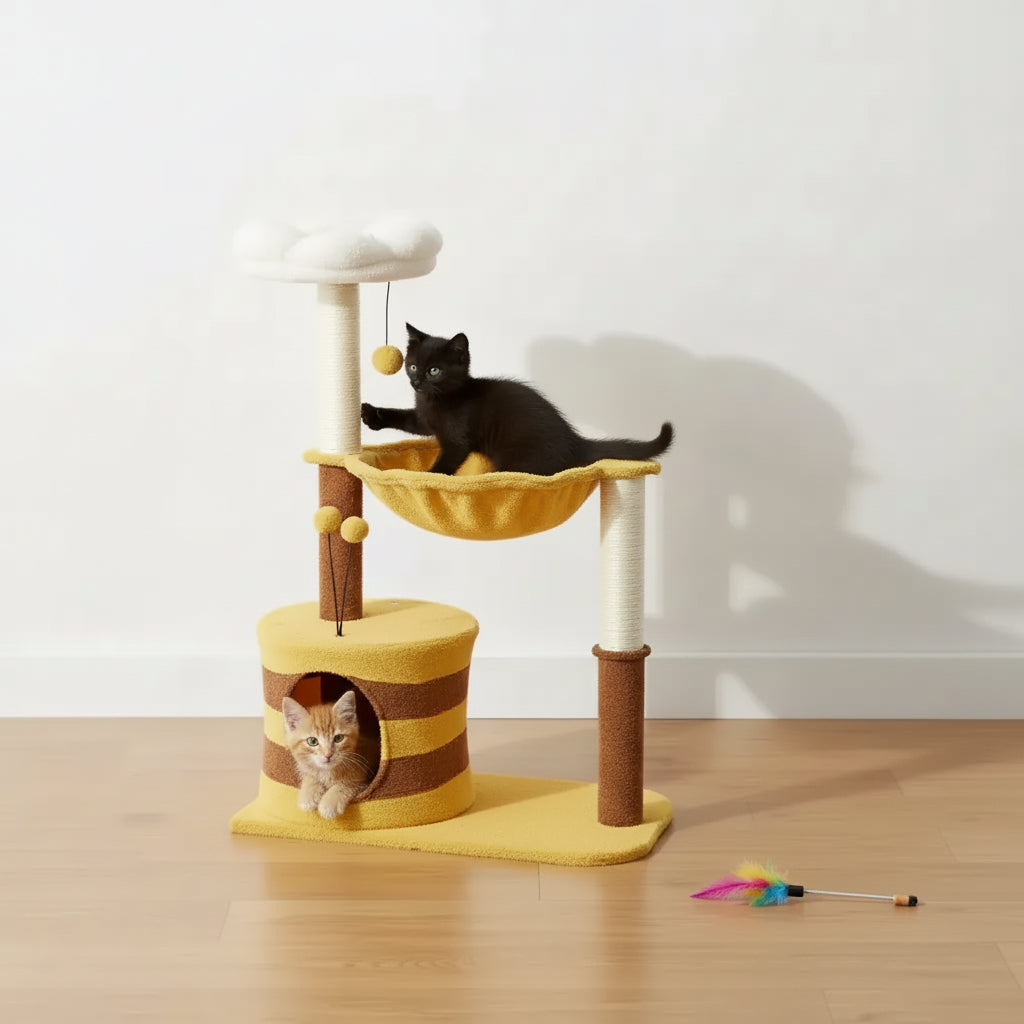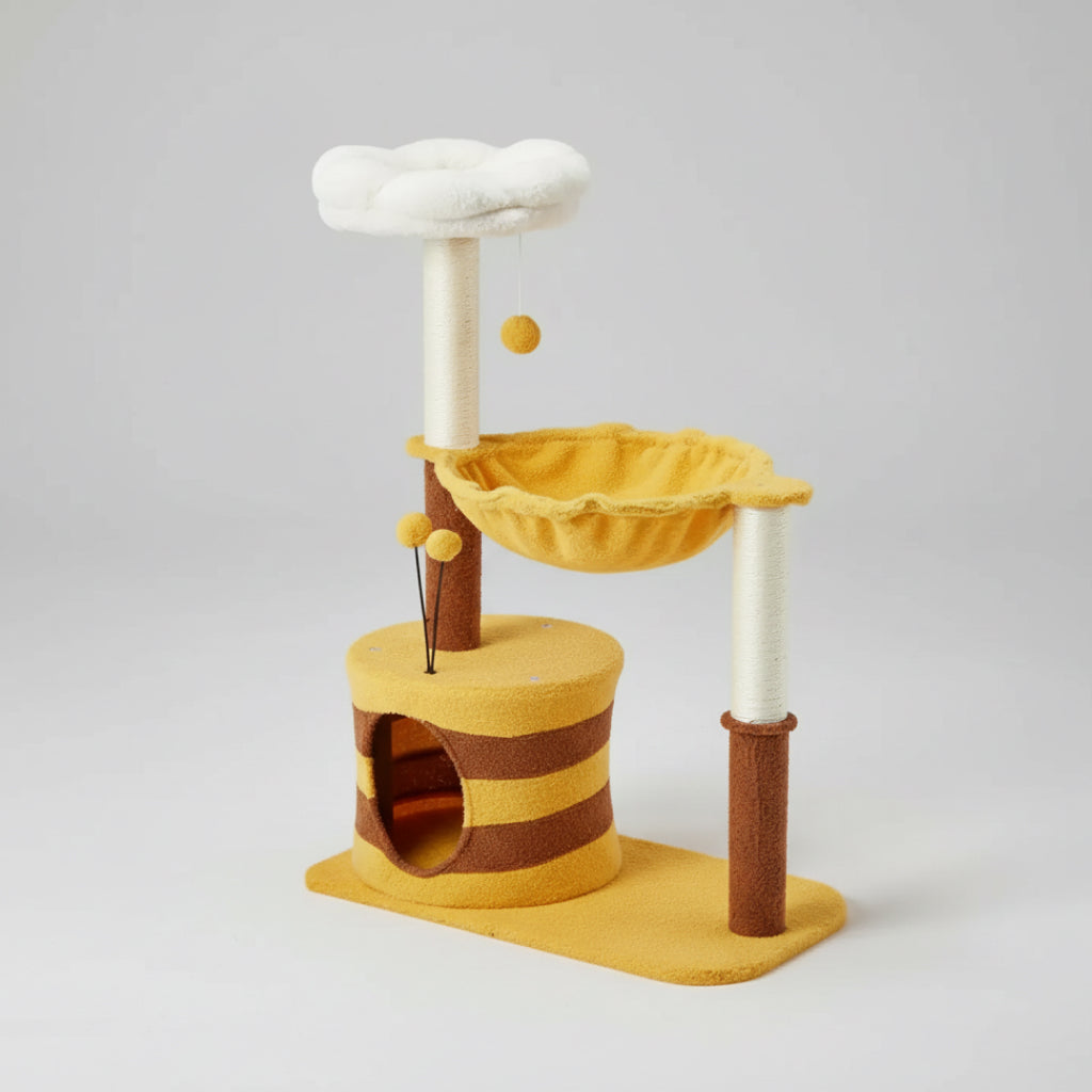 This bee-themed cat tree is a charming addition to any indoor space, designed to provide a fun and engaging playground for your feline friend. With its delightful bee accents, it not only entertains but also enhances your home decor. The durable construction includes sisal-covered scratching posts to keep your cat's claws healthy while protecting your furniture.