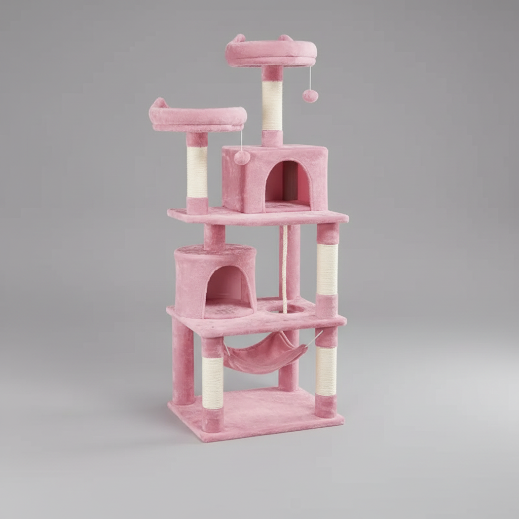 Discover our multi-level cat tree tower, designed to provide your feline friends with a cozy retreat and an activity center to keep them entertained. This cat tree features unique cat-ear-shaped perches, fluffy condos, and a soft hammock for relaxation. It also includes multiple scratching posts to encourage natural scratching behaviors and protect your furniture.